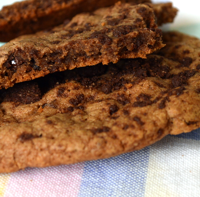 When ready to bake, preheat oven to 350. Arrange chilled dough about 4 inches apart on parchment lined sheet pans. I baked 6 cookies per sheet. Bake for about 14 minutes. (They say 18.) The cookies will puff, crackle and spread, a bit like meringues. They should be faintly browned, but on a chocolate cookie, it is hard to tell.
