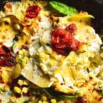 Lasagna in a skillet with corn and roasted tomatoes, plus lots of cheese and herbs is rich and creamy and all made in one skillet!