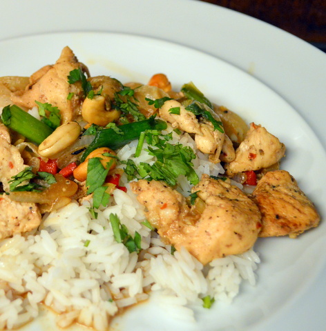 This royal chicken, Thai style, is made with cashews and a simple sauce with lots of black pepper. Serve with stir fried veggies and you have a meal fit for royalty.