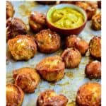 Bake 15-18 minutes or until pretzel bites are golden brown. This is personal preference as you can bake them a bit longer or a bit shorter! Brush with melted butter and sprinkle with coarse salt. OR see other sprinkle suggestions in post above!